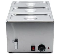 This top quality wet heat countertop bain marie brings incredible value for money to everyday caterers, whatever the type of establishment you have. It’s designed to give outstanding performance, day after day. The large full size 1/1 GN size complete with 3 x 1/3 GN pans and lids 150mm deep is great for keeping large quantities of popular items warm and ready to serve. This fantastic bain marie is brought to you at an unbeatable price. It is an extremely easy to clean, wet heat unit with a drain tap and adjustable temperature dial fitted to the front for ease of use. Supplied with 3 x 1/3 GN pans and lids, this is an outstanding buy.