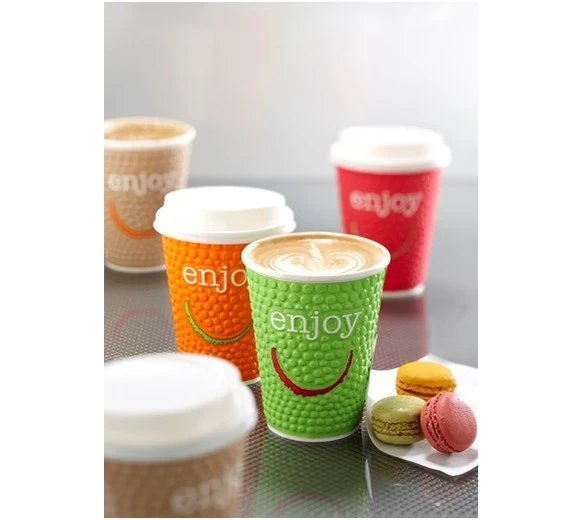 These paper coffee cups maintain temperatures and keep liquids secure to avoid burns. Ideal for drinking hot beverages on the go such as frothy cappuccinos, creamy lattes, and luxury hot chocolates. The double wall structure of the new Enjoy cups protects customers’ hands from the warmth of hot drinks without the need for double-cupping or the use of sleeves, thus minimising costs and reducing storage space.