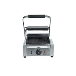 This contact panini grill has a top and bottom ribbed cast iron plate press that gives that signature grill experience. It’s perfect for chicken, paninis, burgers, and more. This product offers a reliable performance that is especially ideal for cafes and outdoor catering.